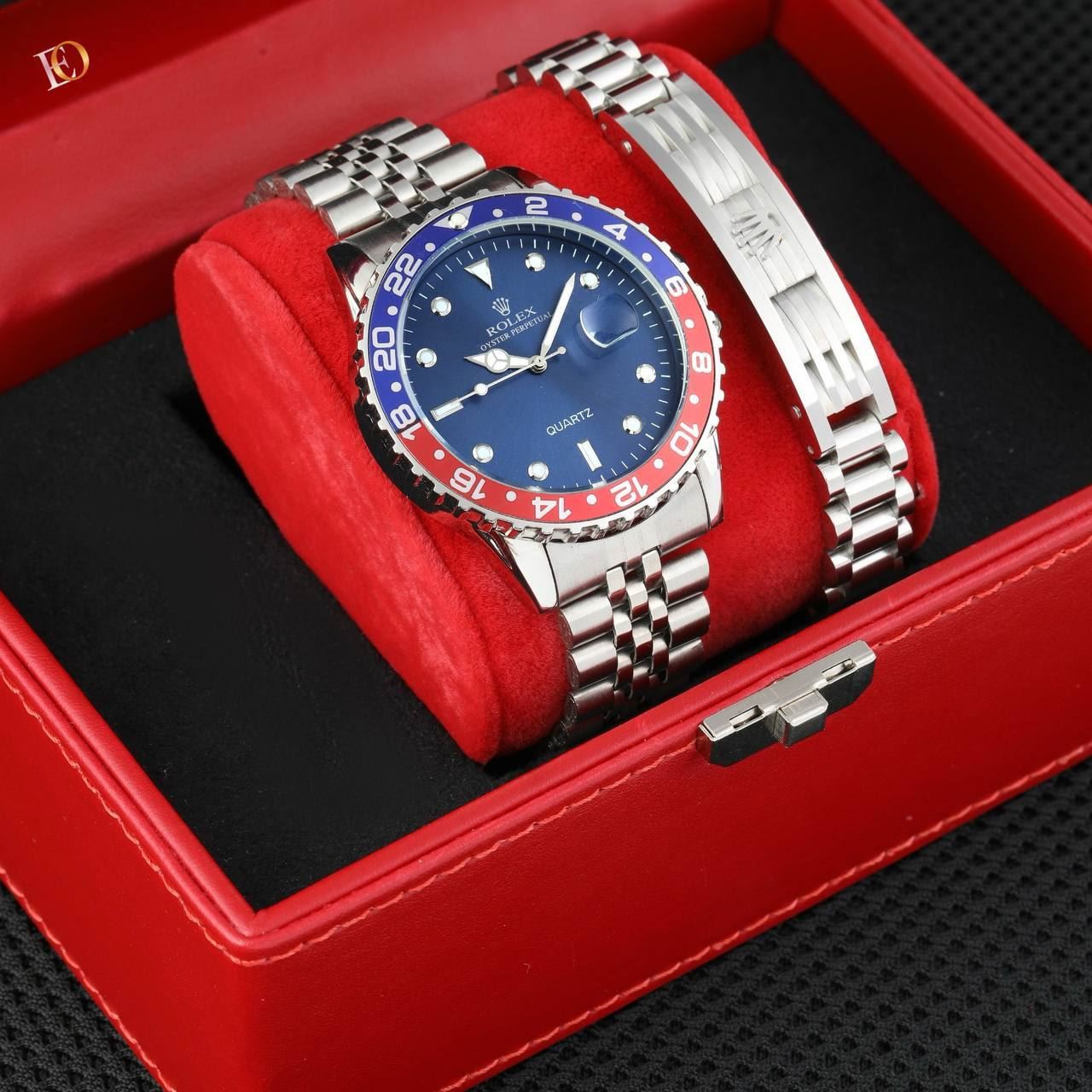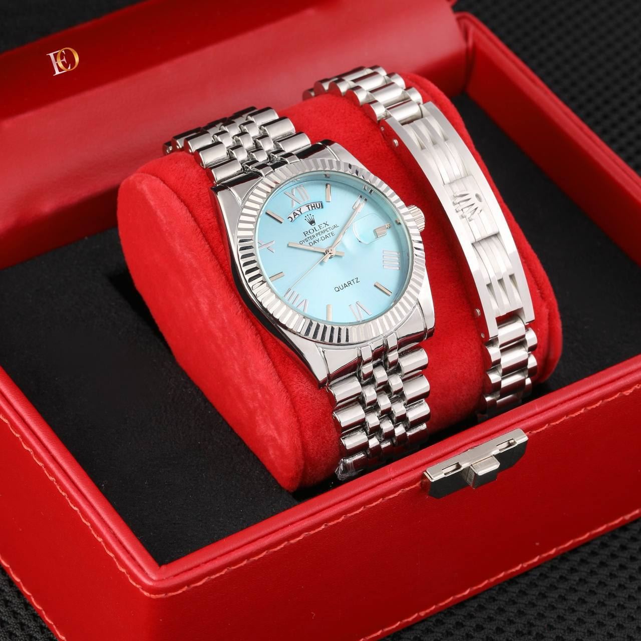 Comprar Conjunto reloj y pulsera de acero Rolex por 60,00€. Stock del producto según combinación. Disponible en colores: azul; blanco; celeste; negro; plateado; rojo; verde.