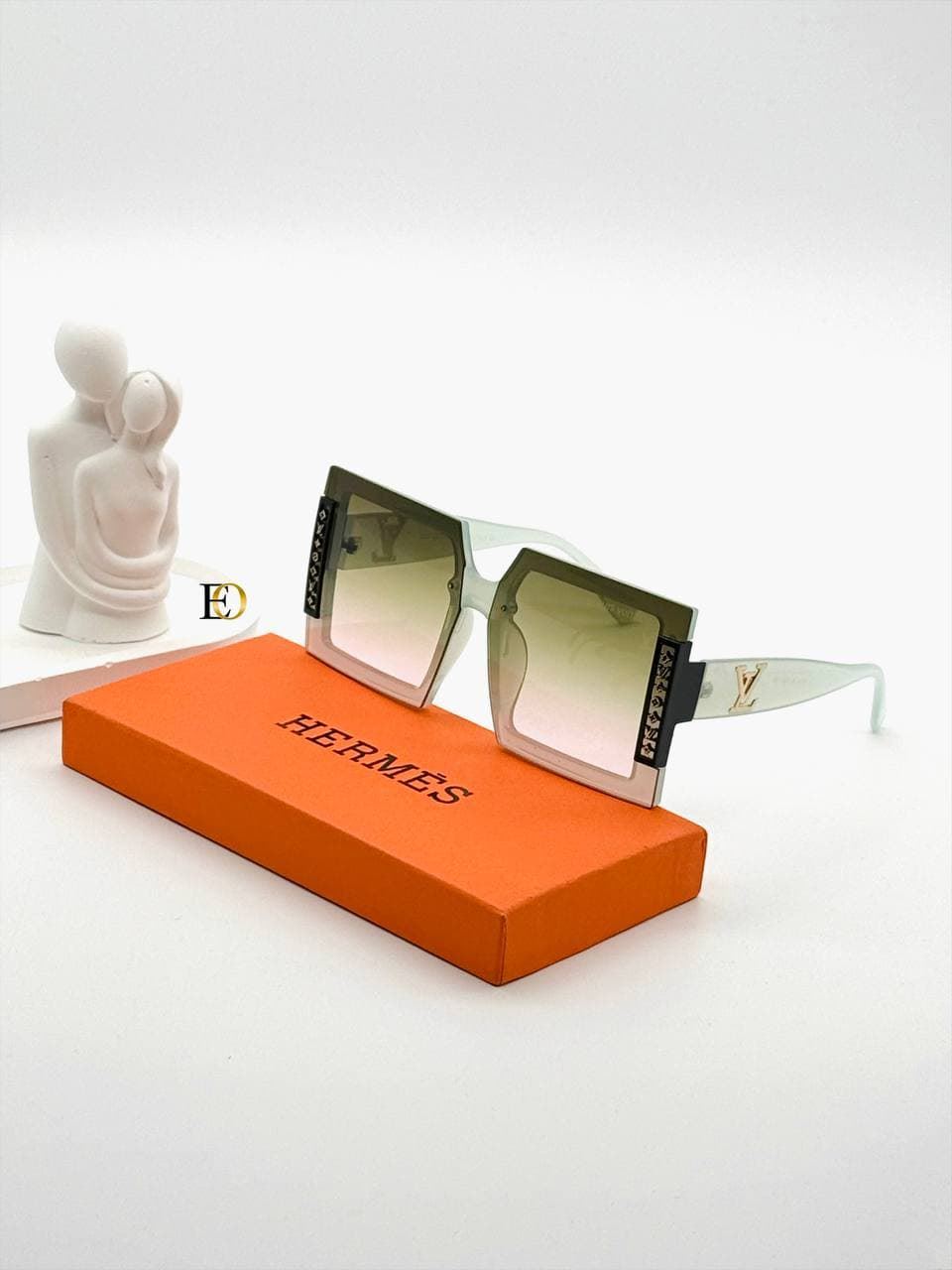Gafas cuadradas polarizadas con caja protectora y código QR.