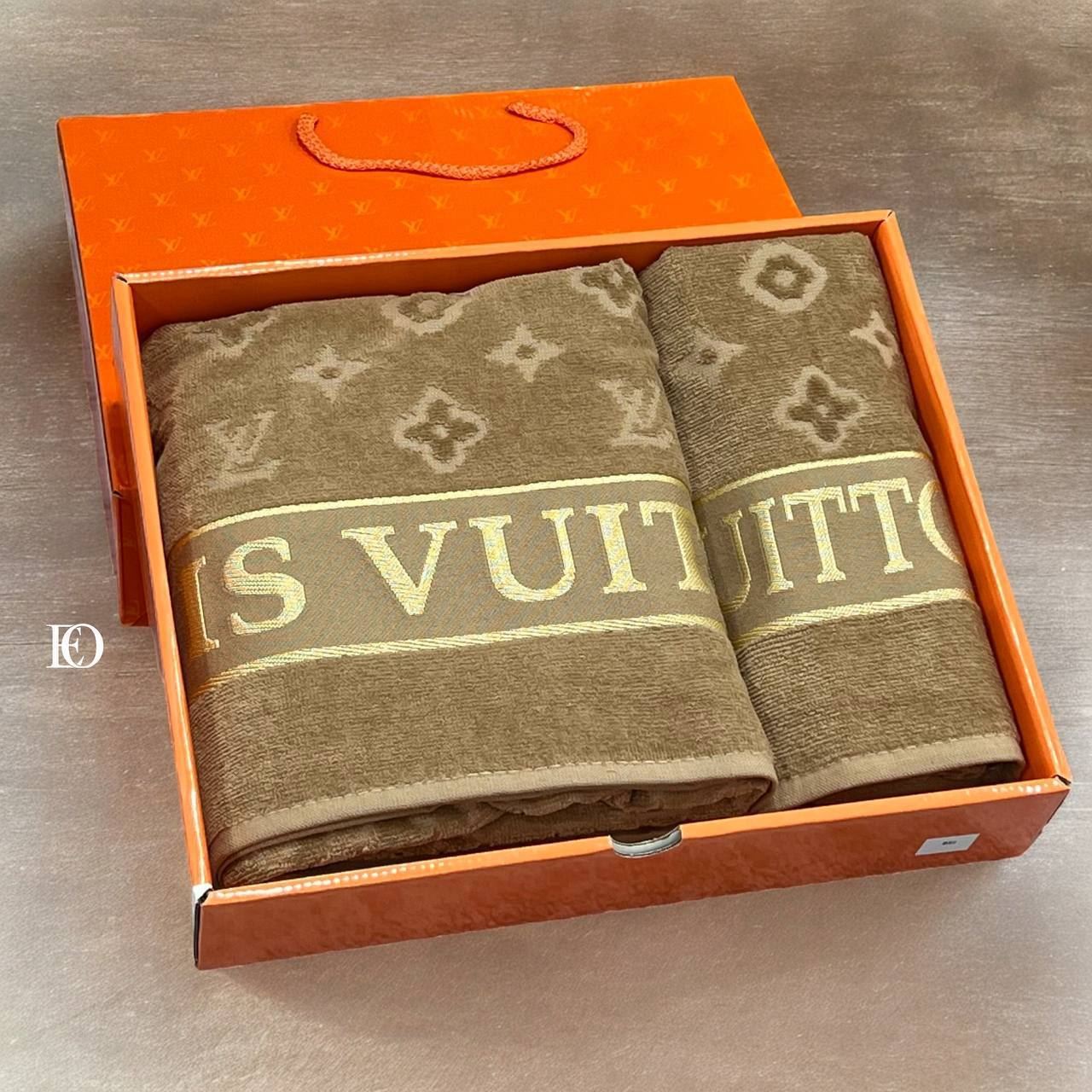 Toallas de baño Louis Vuitton, presentadas en caja.